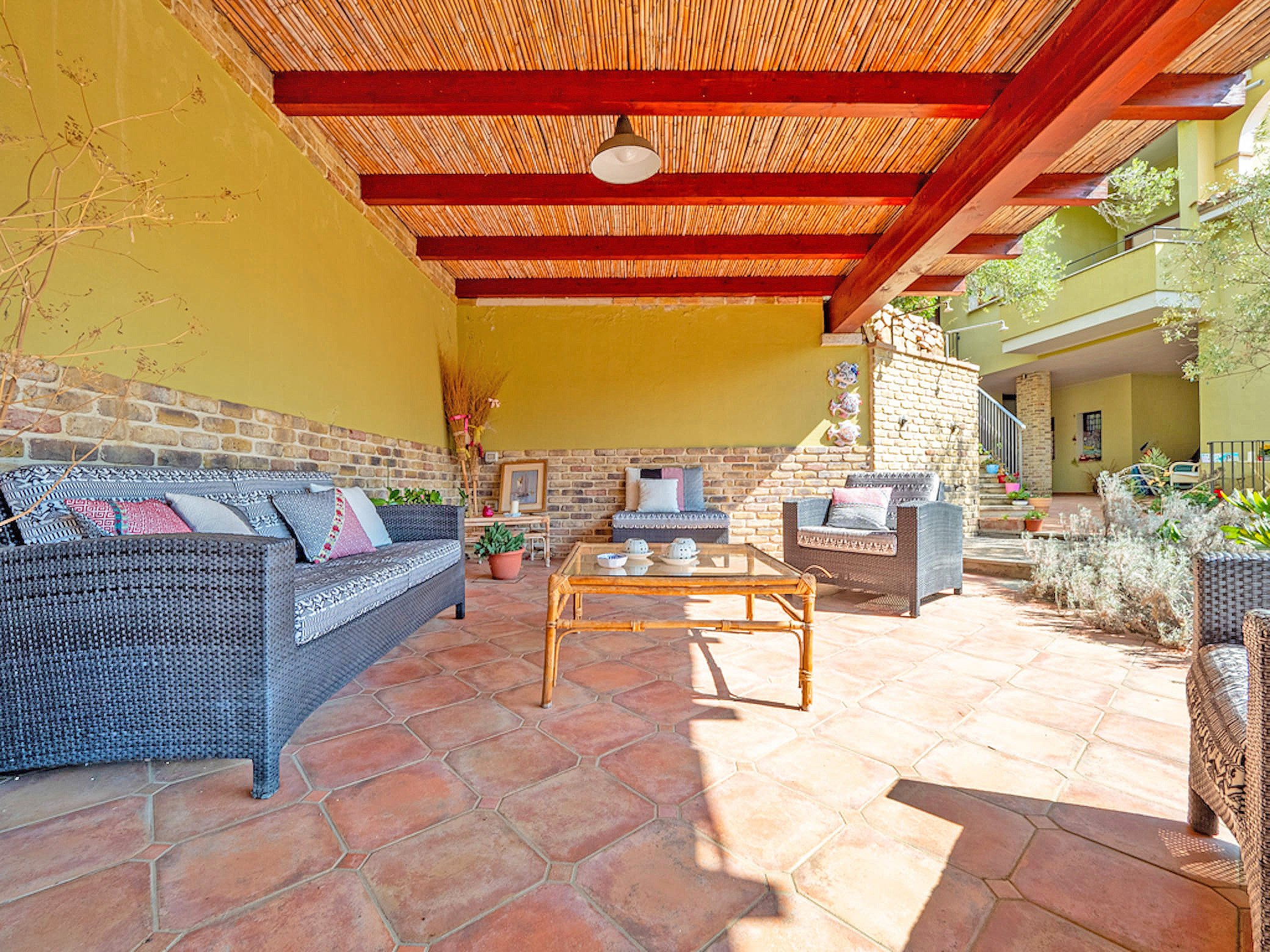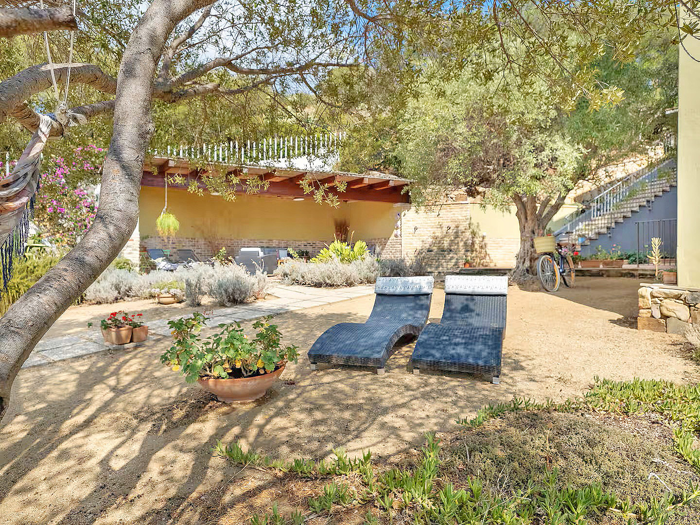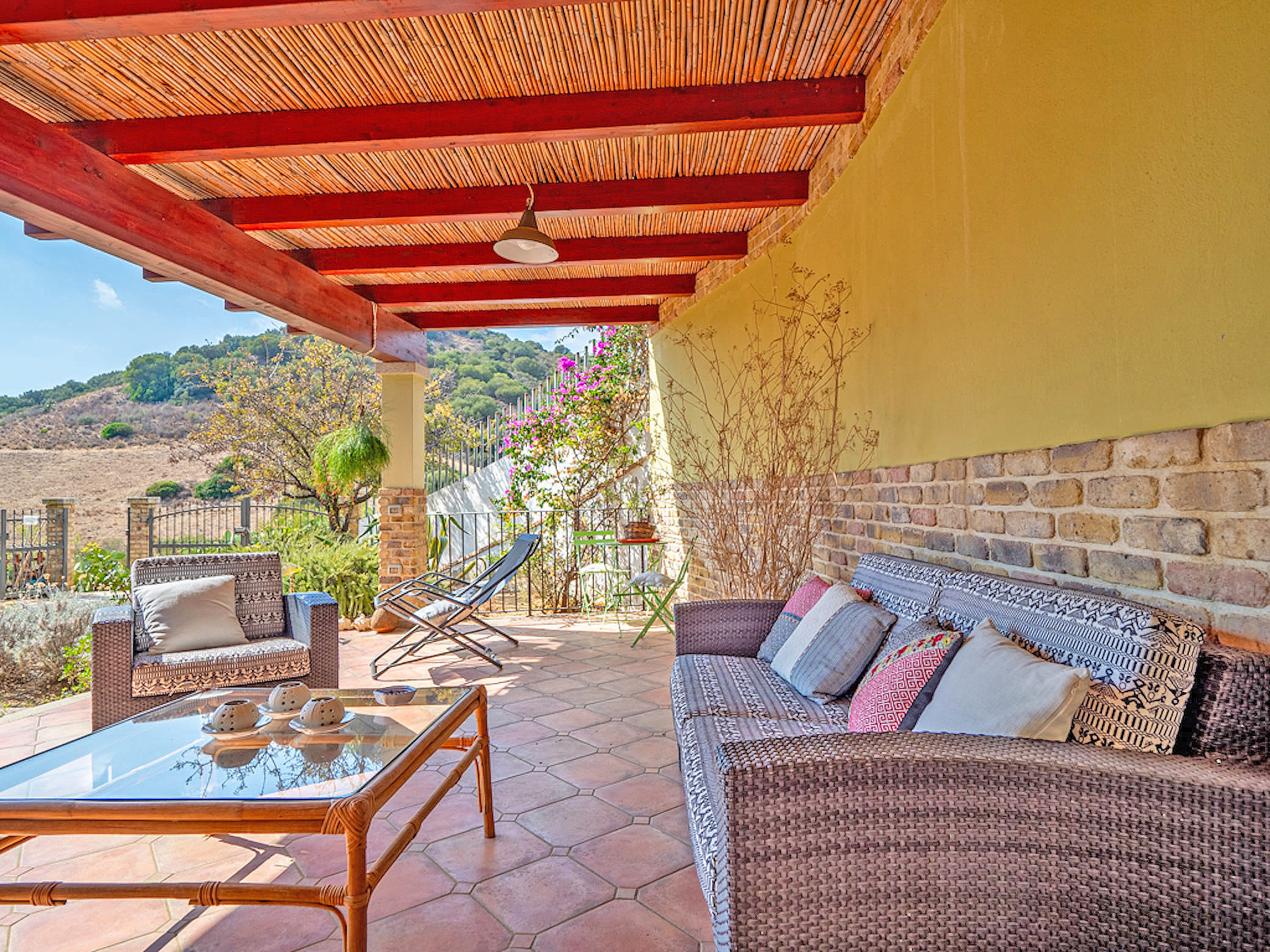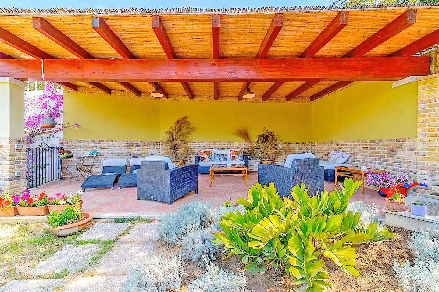 Im Erdgeschoss befindet sich neben einem großen Hof ein gemeinsam nutzbarer super schöner und überdachter Terrassenbereich, der mit Außensesseln, Liegen und zwei beheizten Außenduschen und einem Grill verschönert ist.