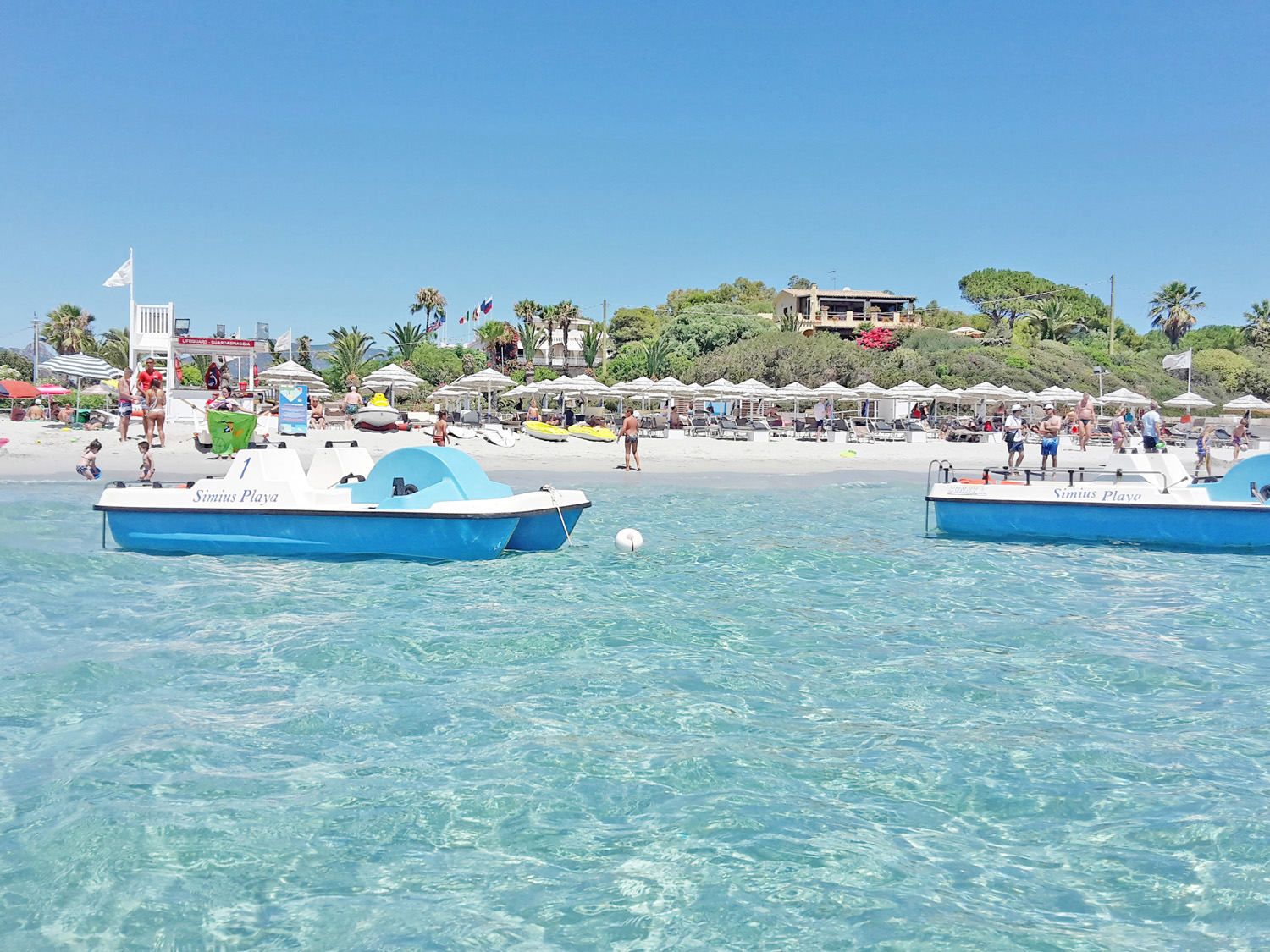 Die wunderschönen weißen Sandstrände von VILLASIMIUS sind mit einer kurzen Autofahrt oder dem Shuttlebus erreichbar. Obwohl ein Auto an diesem Ort nicht unbedingt erforderlich ist, wird es während Ihres Urlaubs immer empfohlen. Der nächste Sandstrand von „Spiaggia Simius“ liegt nur ca. 1800 m entfernt und könnte auch in ca. 20 Minuten fußläufig erreicht werden.