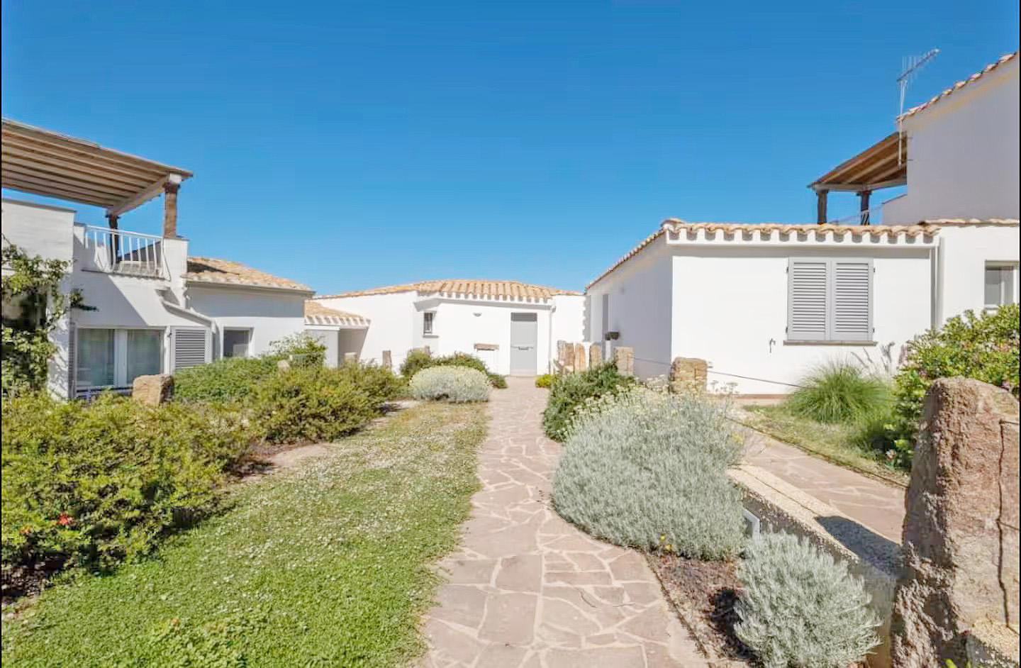 Dieses Ferienhaus mit einer Wohnfläche von ca. 95 qm befindet sich in einer kleinen neu erbauten Residenz von 6 weiteren für sich separaten Reihenhäusern, direkt am Strand und Meer von CALASETTA im nordwestlichen Teil von SARDINIEN.