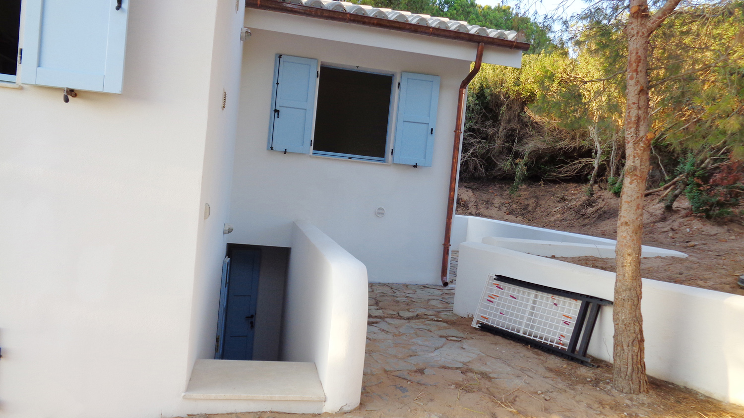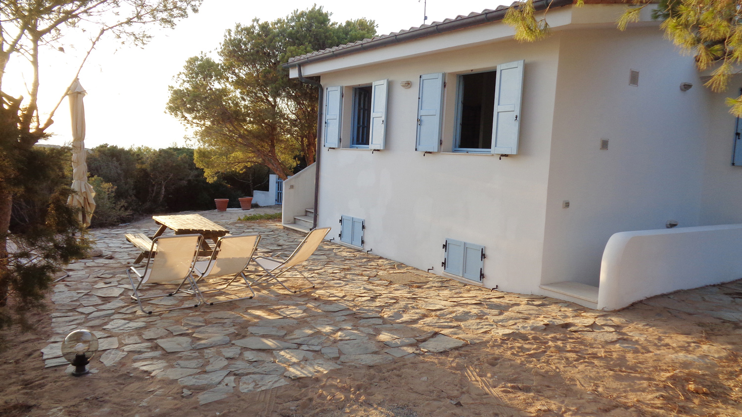 Freistehendes Ferienhaus direkt am Meer und naturbelassener mediterraner Vegetation Nähe traumhafter weißer Sandstrände und kleinen Buchten von "Porto Pinetto" - PORTO-PINO im Süden von SARDINIEN. Sehr geeignet für einen entspannten und erholsamen Urlaub für eine max. Belegung von 4 Erwachsene + 2 Kinder. Auf einer Wohnfläche von ca. 80 qm über 2 Ebenen stehen dem Gast zur Verfügung: 1 großer Wohn-/ Essraum mit Kamin und integrierter Küche - 1 Eheschlafzimmer mit Baldachin - 2 Schlafzimmer mit franz. Ehebetten als Klappsofa - 2 Badezimmer mit Dusche/ WC/ Bidet - eingezäunter Gartenbereich mit möbliertem Freisitz und Meerblick.