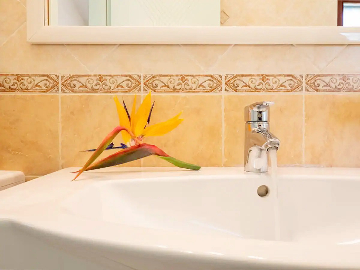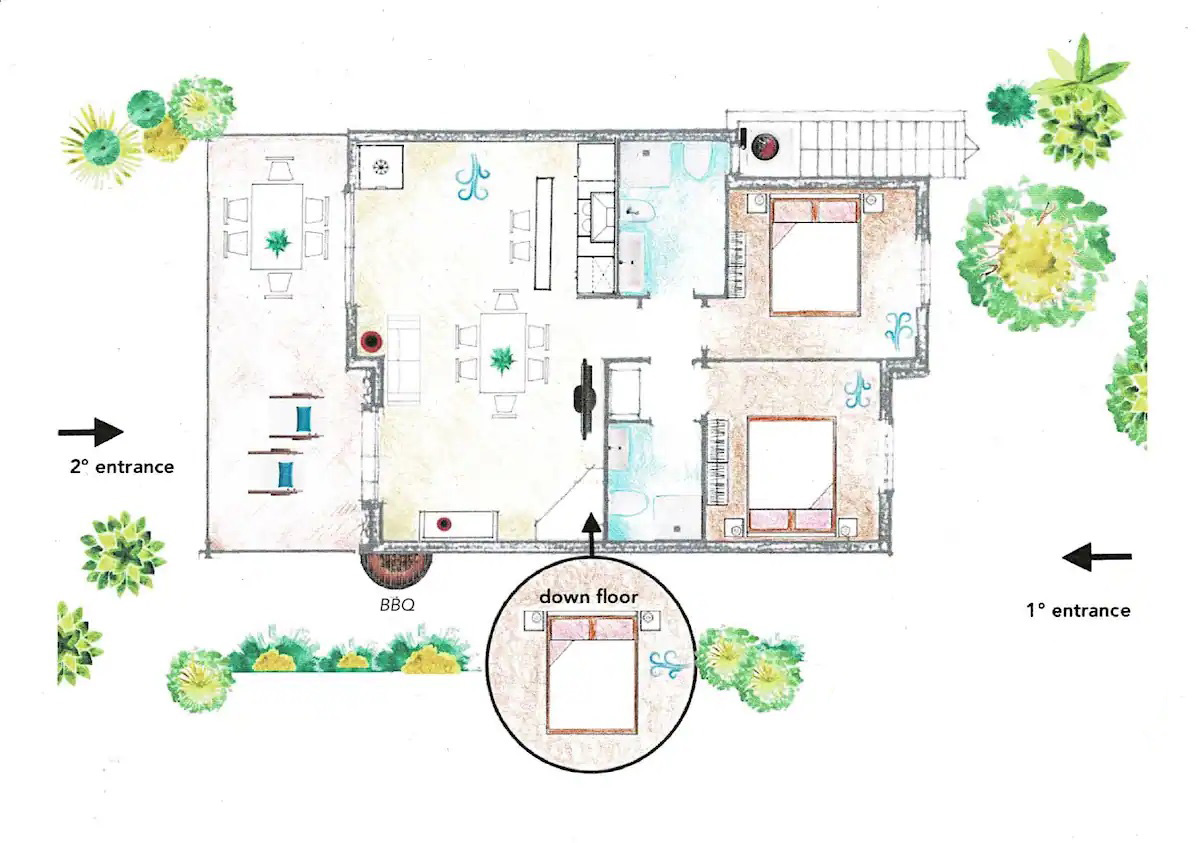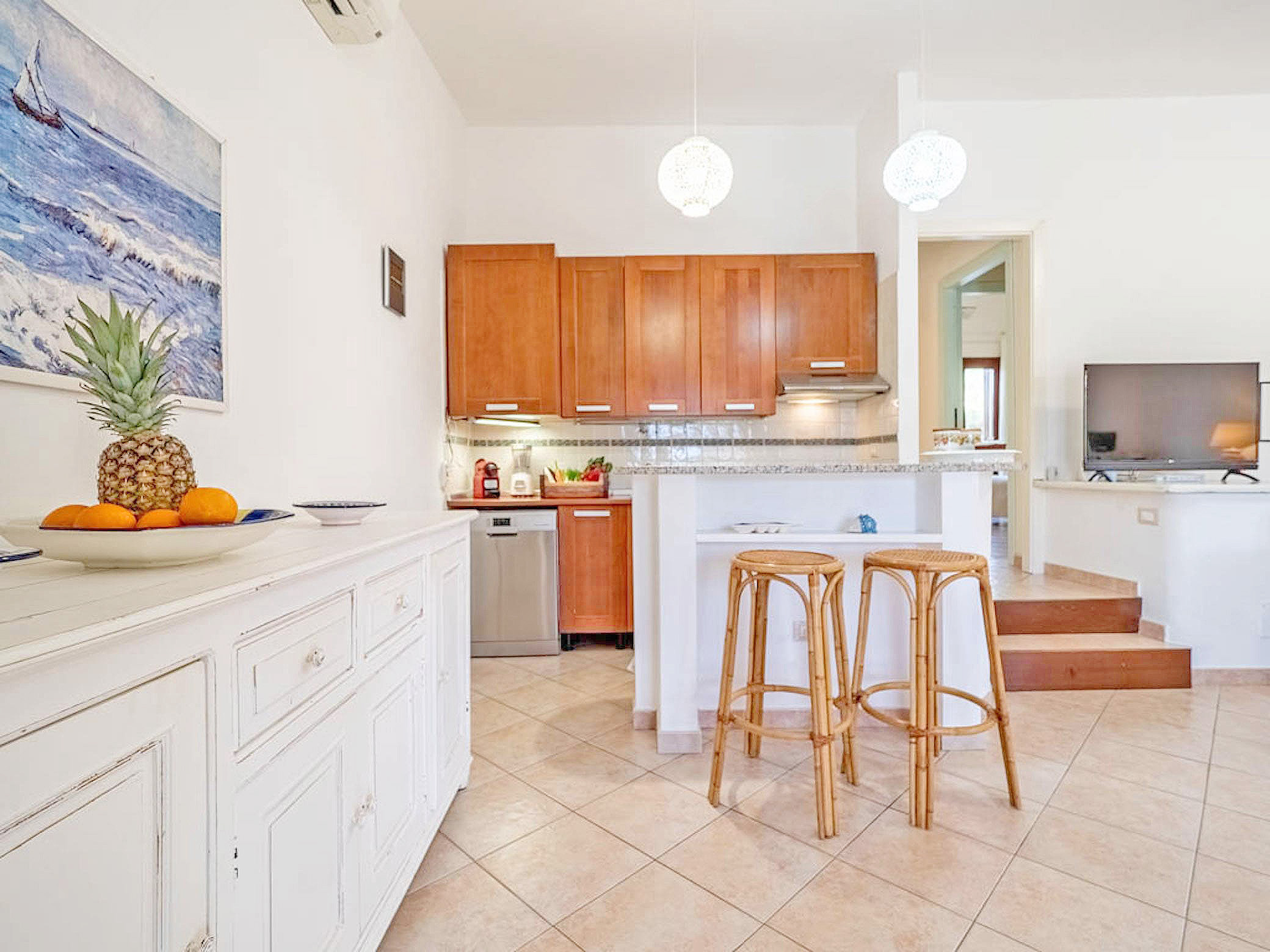 Der offene Wohnbereich bietet: Wohn-/ Essraum mit Ausgang zum überdachten und möblierten Terrassenbereich mit Grillkamin - haushaltsgerechter Küchenzeile mit Geschirrspülmaschine - 3 Schlafzimmer mit Ehebetten - 2 Badezimmer mit Dusche/ WC/ Bidet. Alle Zimmer sind mit Klimaanlage ausgestattet.
