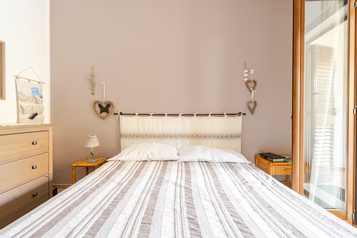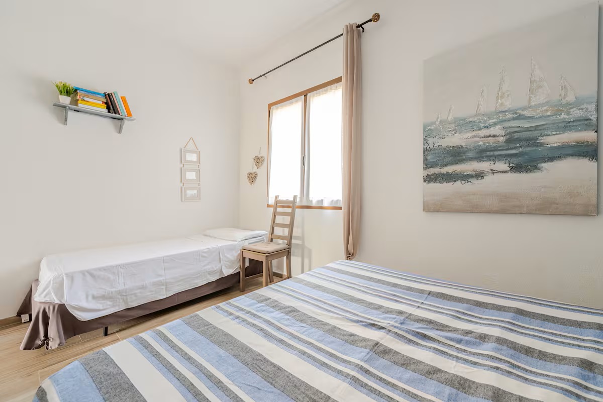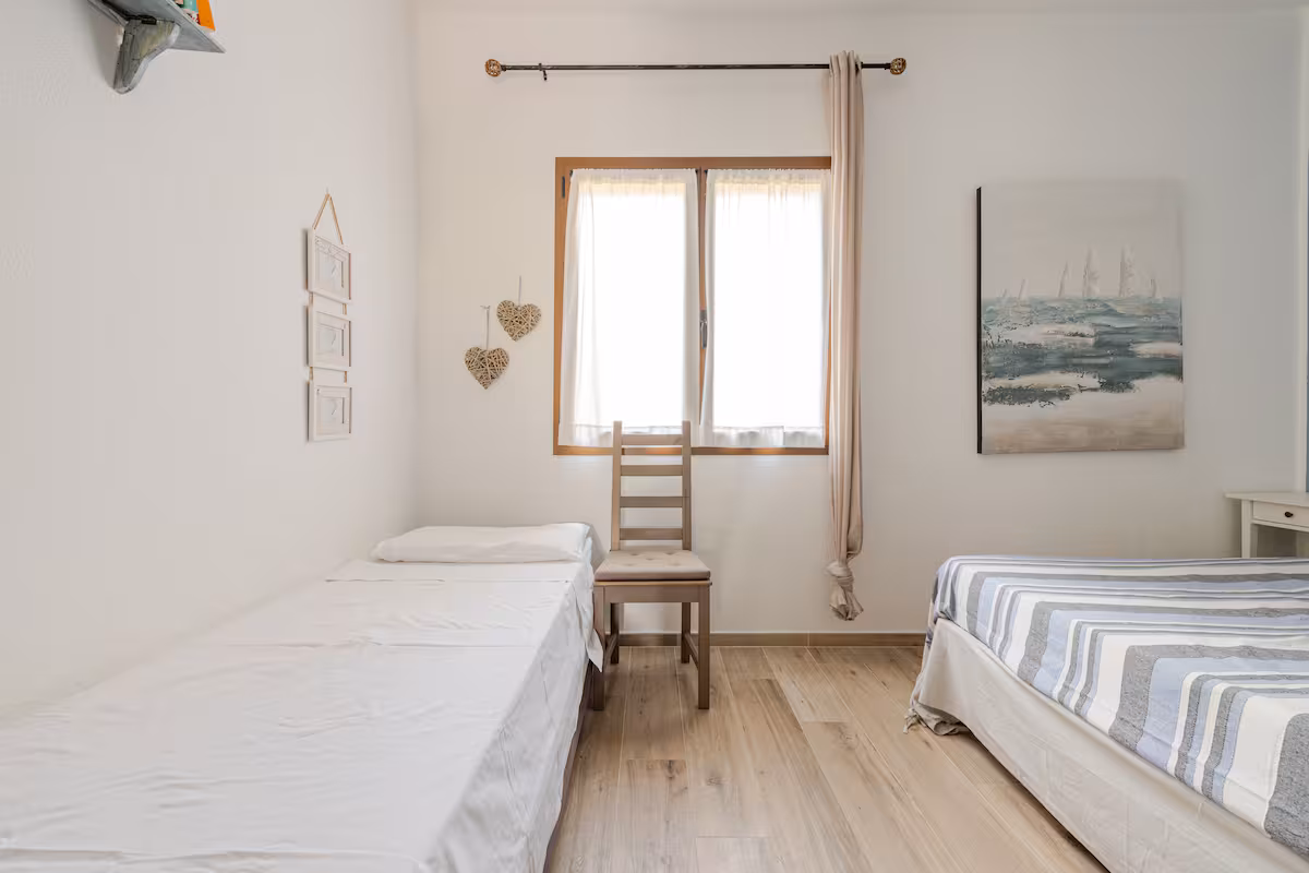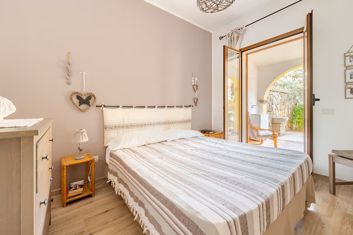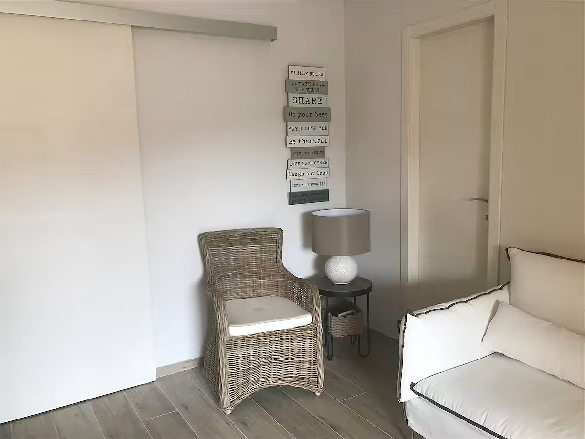 Die Räumlichkeiten dieser Wohnung befinden sich auf einer Ebene und bieten Platz für eine Belegung von max. 5 Personen und teilen sich wie folgt auf: 1 Wohn-/ Essraum mit integrierter Küchenzeile und Ausgang zu einer überdachten möblierten Terrasse und Gartenbereich - 1 Schlafzimmer mit Ehebetten - 1 Schlafzimmer mit Ehebetten + 1 Einzelbett - 1 Badezimmer mit Dusche/ WC/ Bidet.
