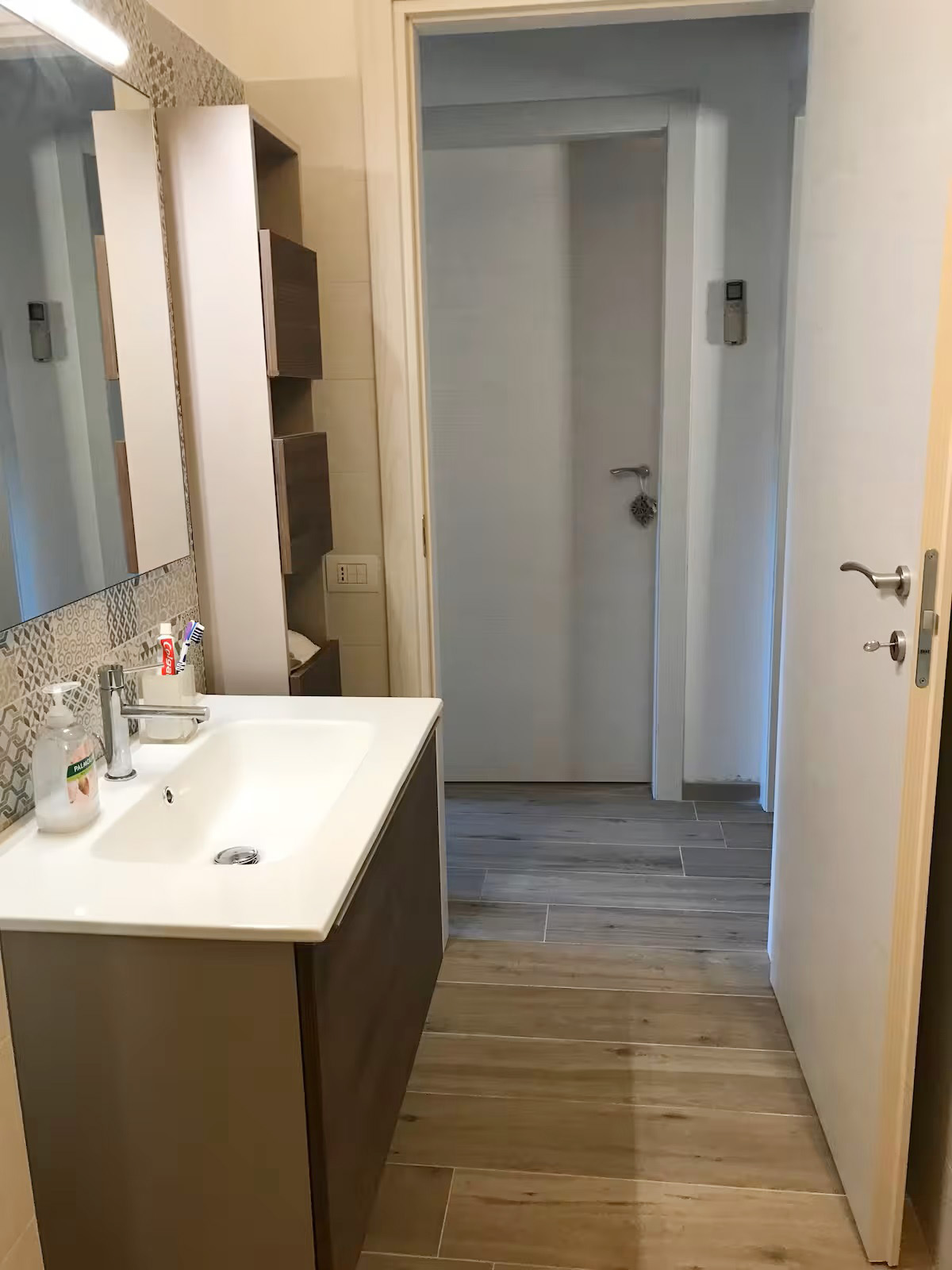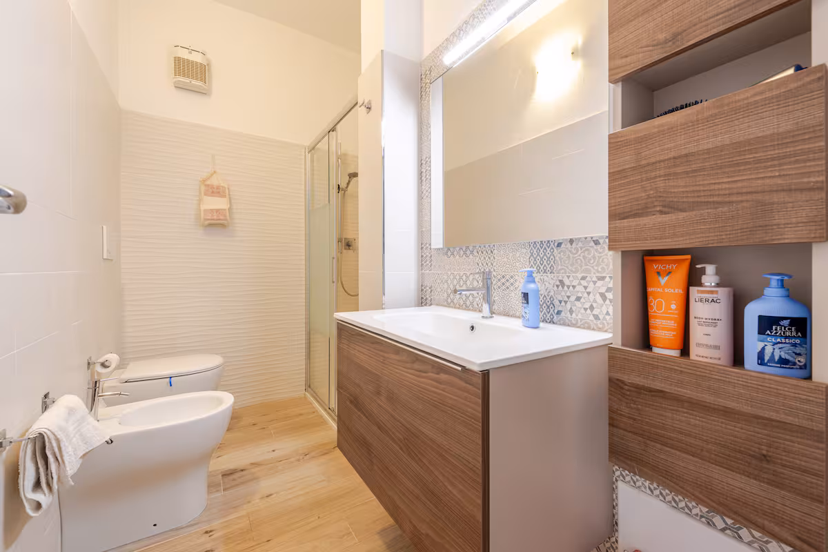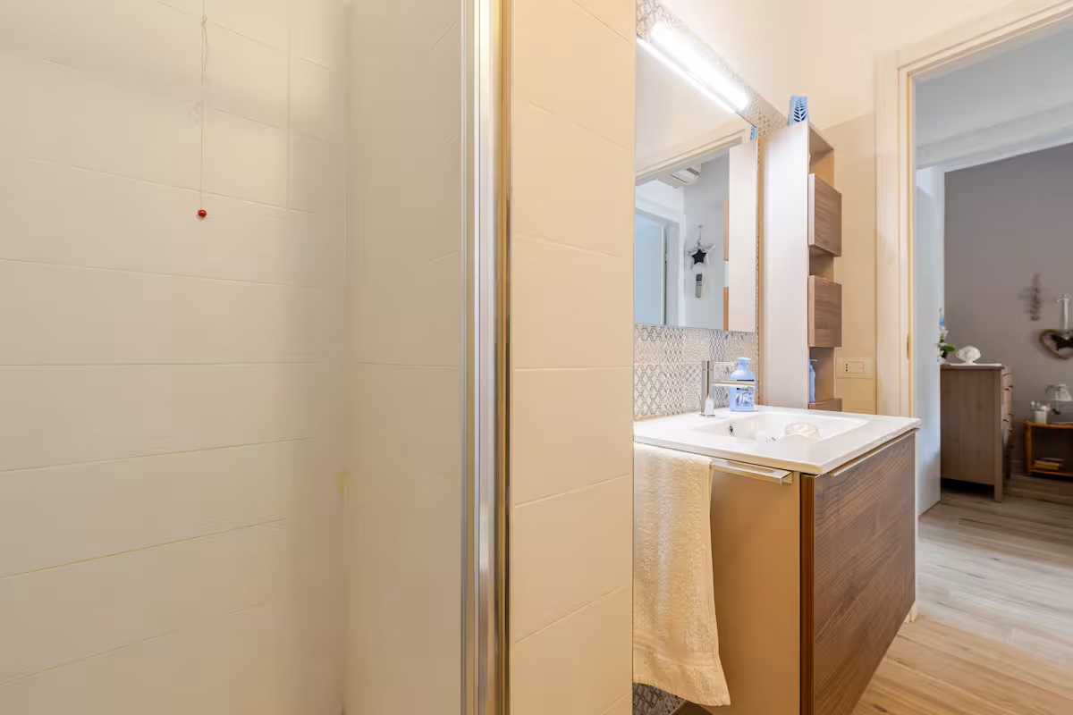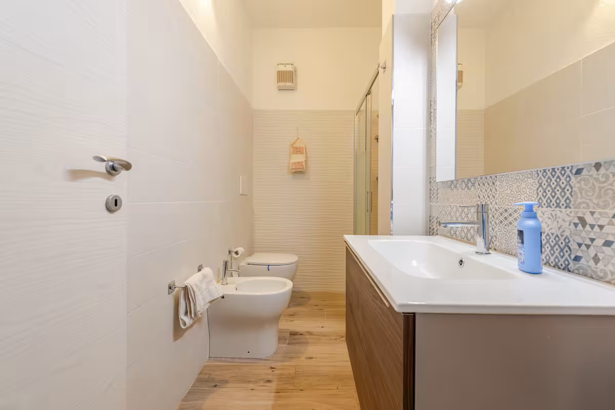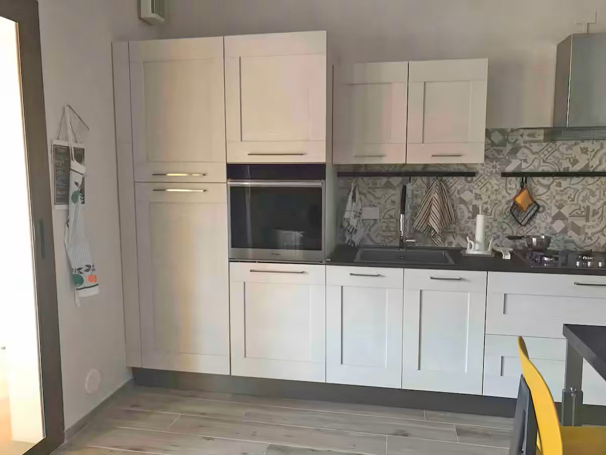 Die Räumlichkeiten dieser Wohnung befinden sich auf einer Ebene und bieten Platz für eine Belegung von max. 5 Personen und teilen sich wie folgt auf: 1 Wohn-/ Essraum mit integrierter Küchenzeile und Ausgang zu einer überdachten möblierten Terrasse und Gartenbereich - 1 Schlafzimmer mit Ehebetten - 1 Schlafzimmer mit Ehebetten + 1 Einzelbett - 1 Badezimmer mit Dusche/ WC/ Bidet.