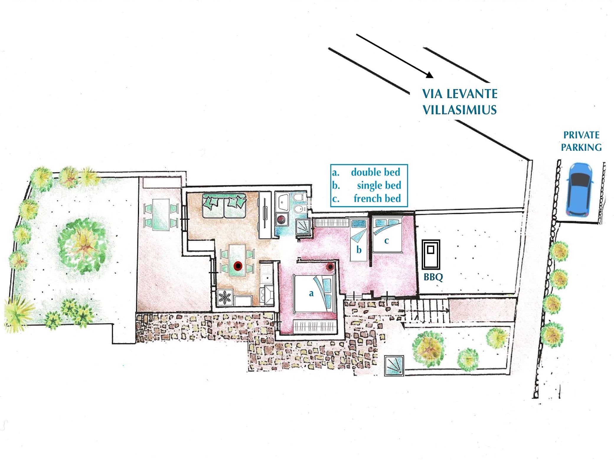 Nur wenige Gehminuten (ca. 300 m) entfernt vom weißen Sandstrand und kristallklarem Meer von „Spiaggia Simius“ Region VILLASIMIUS entfernt - in einer ruhigen Wohn-Anlage - befindet sich dieses von 3 Seiten unabhängige Ferienhaus umgeben von einer kleinen Gartenfläche und einer möblierten Terrasse mit Grillmöglichkeiten die für Mittag- und Abendessen im Freien eingerichtet ist. Die Straße, in der wir uns befinden „Via Levante“ ist nicht in den Straßen- oder Fußgängerverkehr eingebunden, da sie nur von Anwohnern genutzt wird, um zu ihren Häusern zu gelangen. Die Gäste können die Stadt VILLASIMIUS auch zu Fuß nach einem kurzen Spaziergang (ca. 1 km) erreichen. Die Stadt ist sehr lebendig und verfügt über alle Dienstleistungen. Unmöglich, sich zu langweilen, dank der zahlreichen Restaurants, Weinstuben, Nachtclubs und der Einkaufsstraße, sardischen Kunsthandwerks und traditionellen Lebensmittelgeschäften. Die ganzjährig von Einheimischen bewohnte Stadt und Region bietet alle Dienstleistungen für einen Urlaub voller Spaß, Nachtleben, Bade- und Freizeitaktivitäten werden in der gesamten Region ausreichend angeboten. Weitere wunderschöne Strände dieser Region können schnell mit dem Auto in wenigen Minuten erreicht werden, wie – „Porto Giunco“ – „Punta Molentis“ – „Porto Sa Ruxi“.