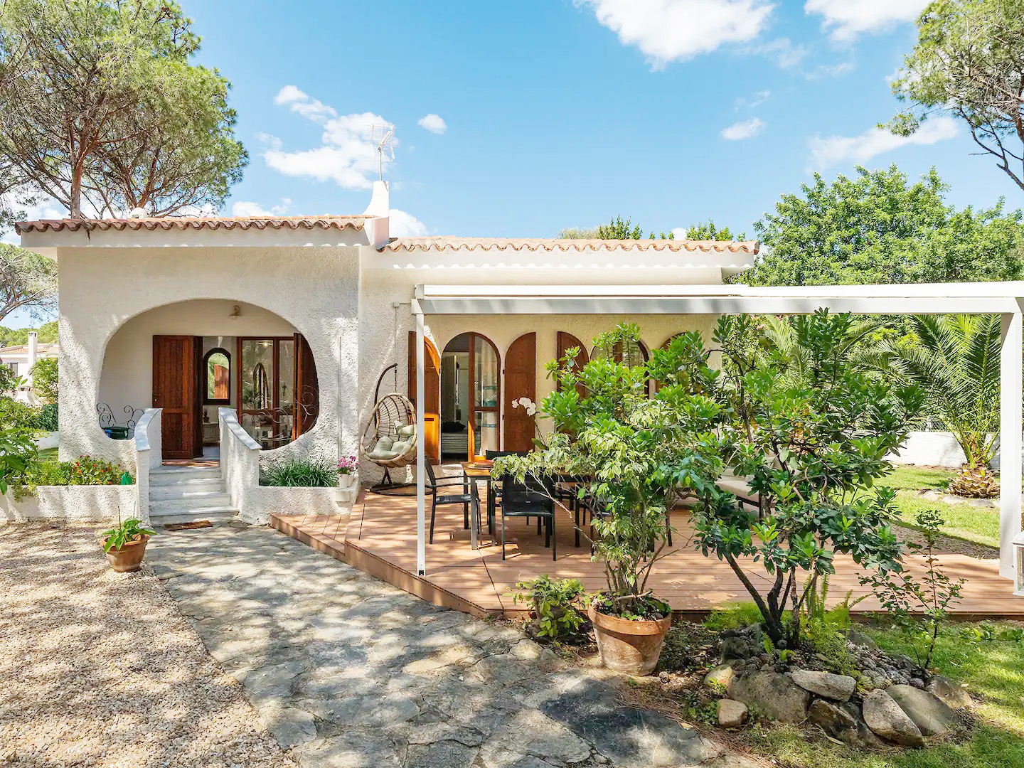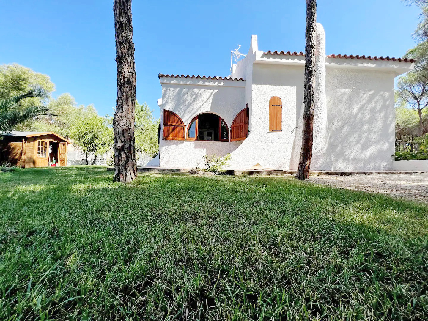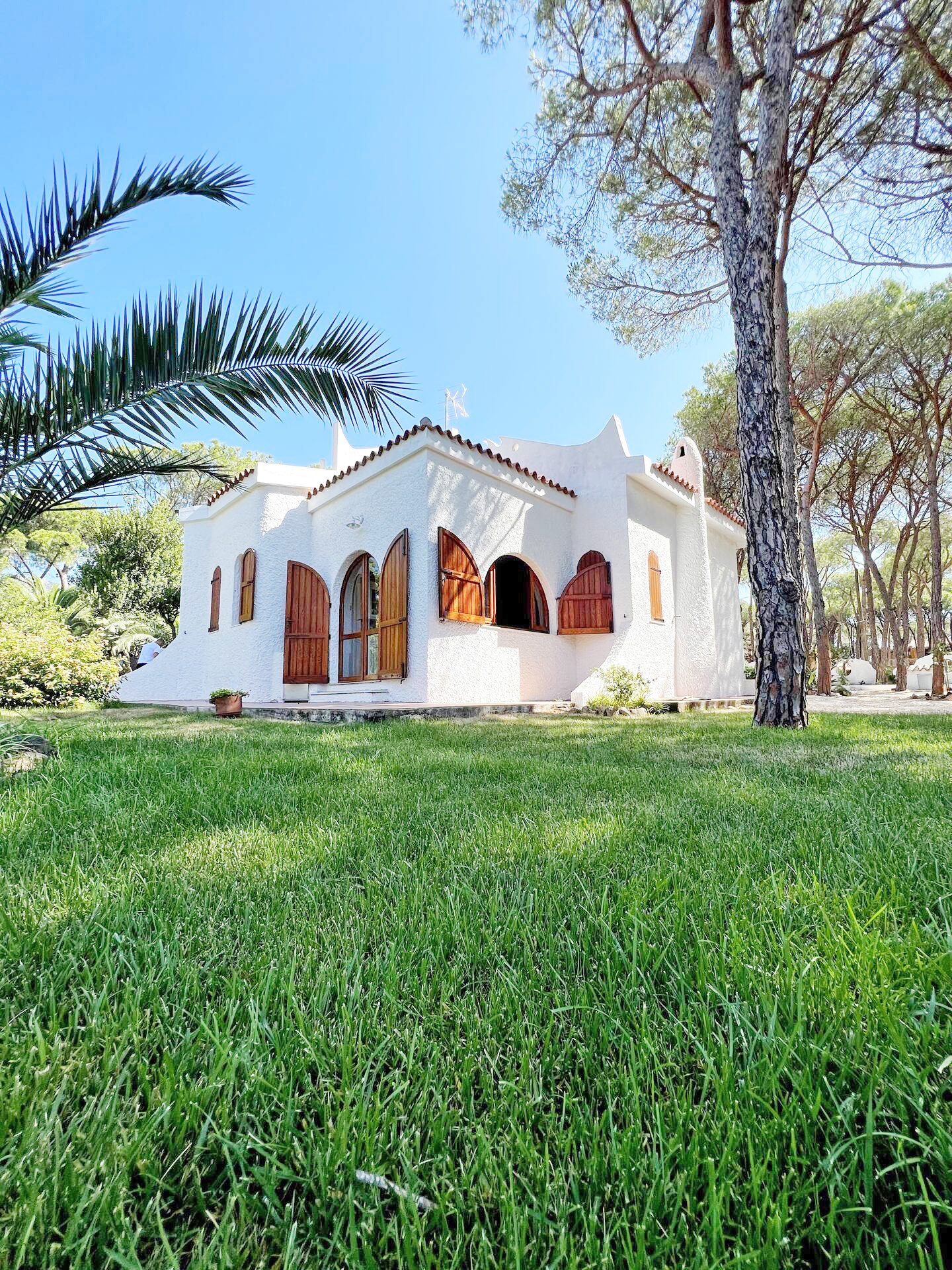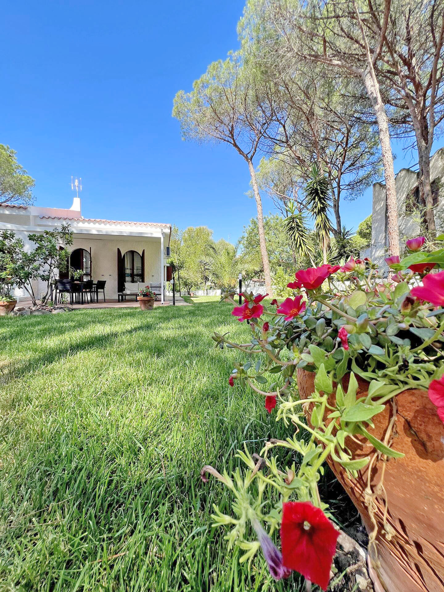 Freistehendes Ferienhaus, umgeben von einem großen eingezäunten mediterranem Gartengrundstück, in einer prestigeträchtigen privaten Wohnanlage direkt am Strand und Meer von „PERLA-MARINA“ – Region „Santa Margherita di Pula“.